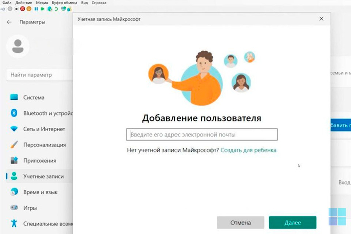 5. Если у ребенка есть свой аккаунт Микрософт или есть email, к которому будет привязана учётка, вводим его сюда. Если учетки нет, нажимаем «Создать для ребенка» и создаем ему e-mail на сайте Microsoft, вводя желаемый адрес, который не занят. Нажимаем «Далее», вводим пароль, нажимаем «Далее», вводим возраст. По возрасту устанавливаются ограничения, которые в будущем можно изменить.