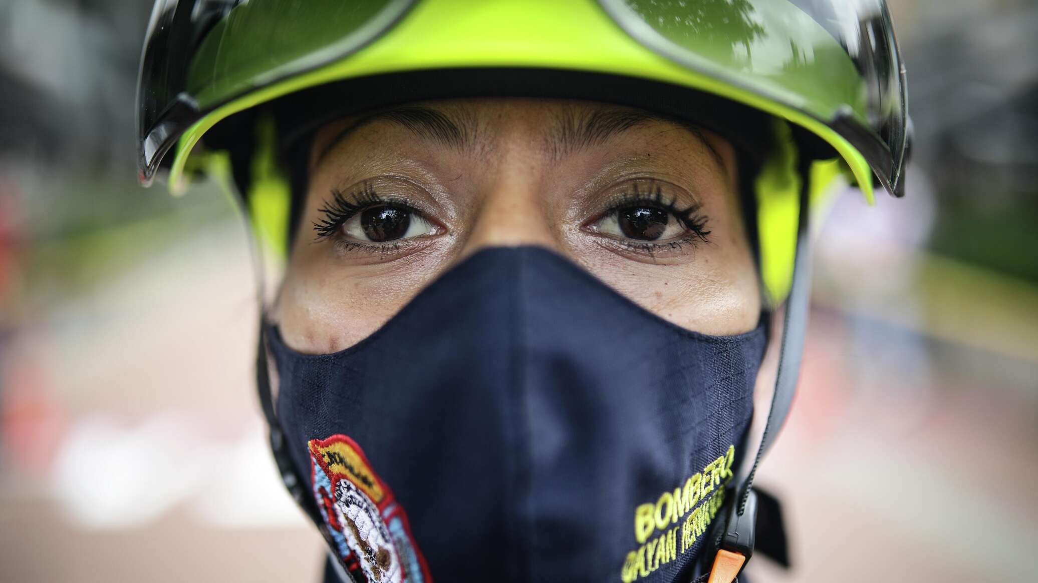 Женщина-пожарный участвует в полосе препятствий вместе со своими коллегами-мужчинами на соревнованиях в Боготе, Колумбия (ноябрь 2021 года).