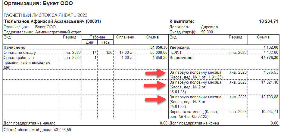 Расчетный листок на сотрудника будет выглядеть так: